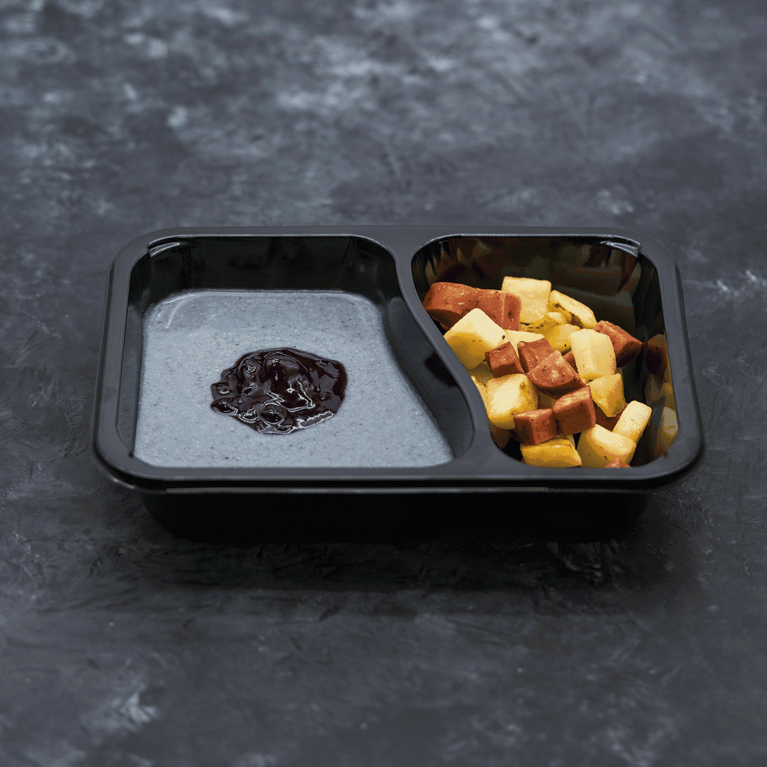 Traditional blue corn mush is sweetened with blueberry Wojapi (a traditional Native berry jam), bison sausage, and potato breakfast hash on the side. A tasty, wholesome start.