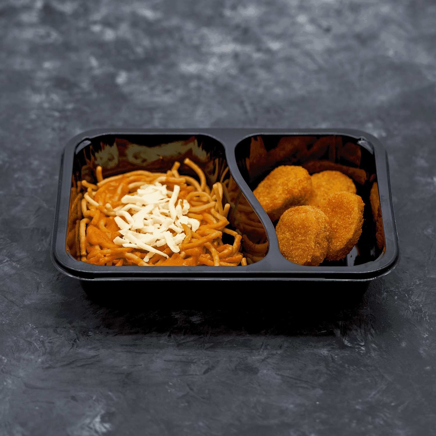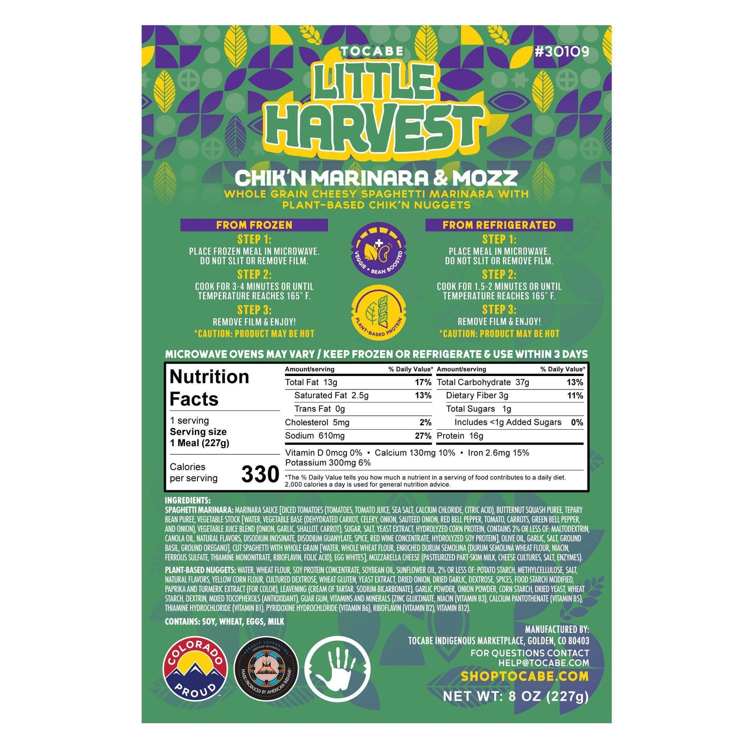 Whole grain spaghetti in a marinara sauce boosted with veggies and protein-rich tepary beans (a traditional, drought-tolerant Native crop), plus plant-based whole-grain nuggets and a sprinkle of parmesan. A tasty, kid-friendly marinara mashup.