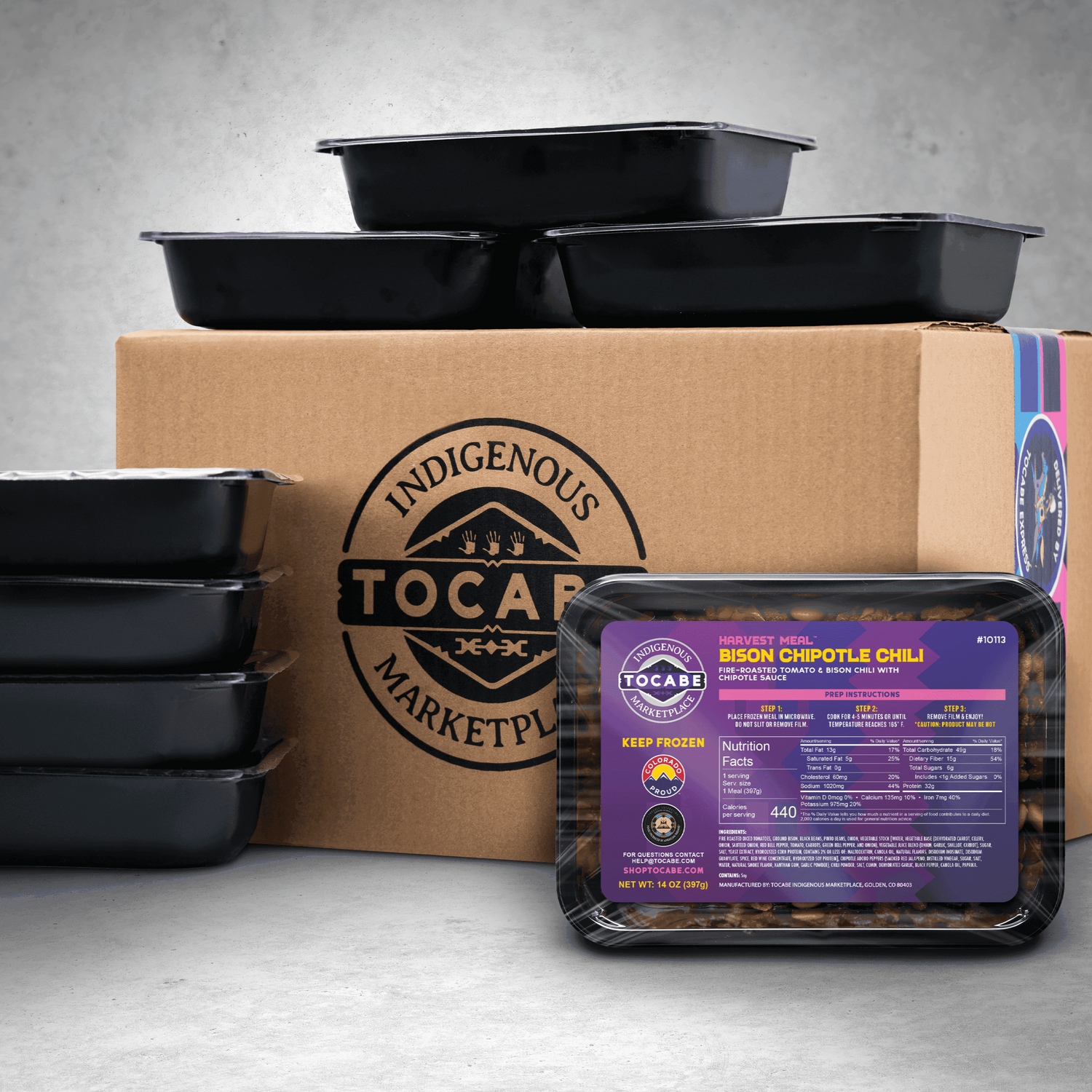 Seasoned ground bison, fire roasted tomatoes, caramelized onions, black beans, and pinto beans, with chipotle chilies slow simmered and ready to enjoy.