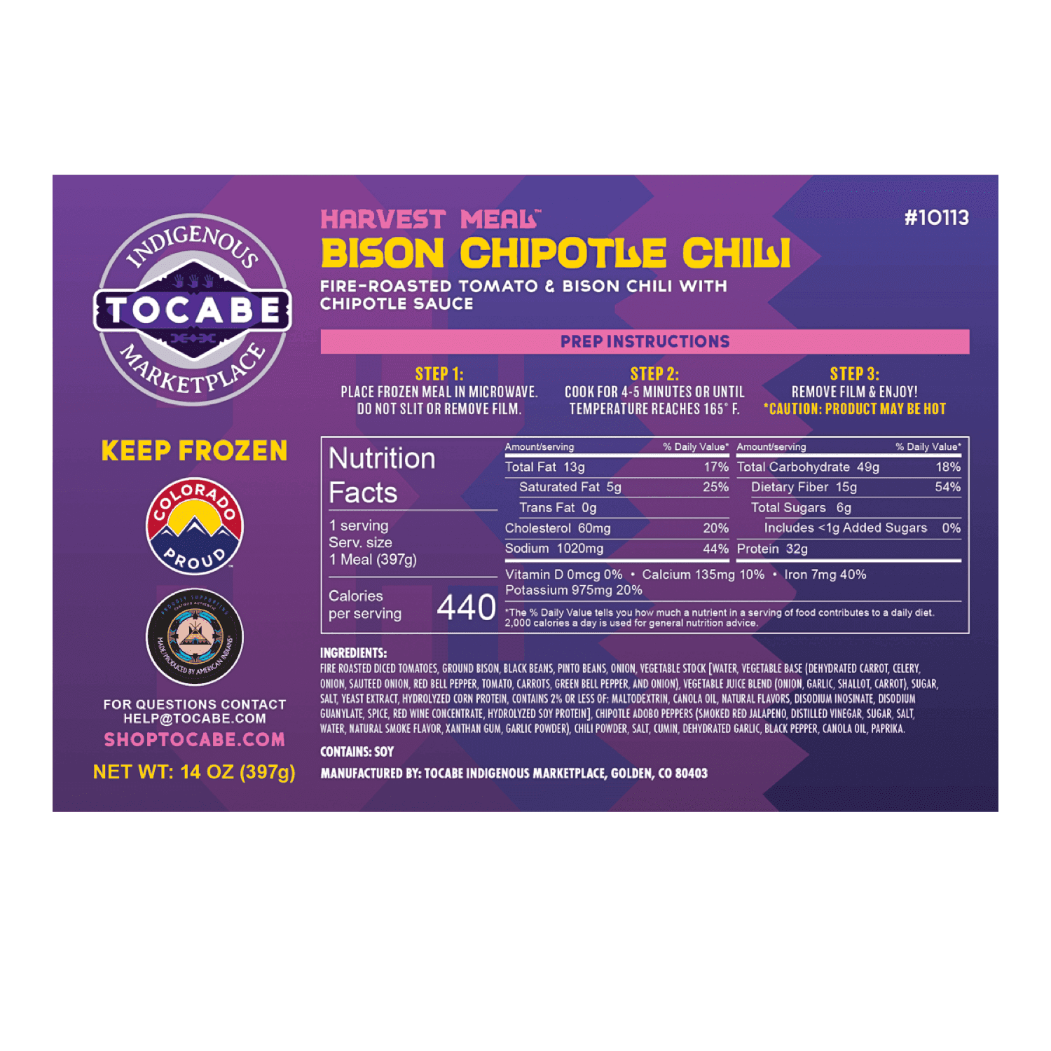 Seasoned ground bison, fire roasted tomatoes, caramelized onions, black beans, and pinto beans, with chipotle chilies slow simmered and ready to enjoy.