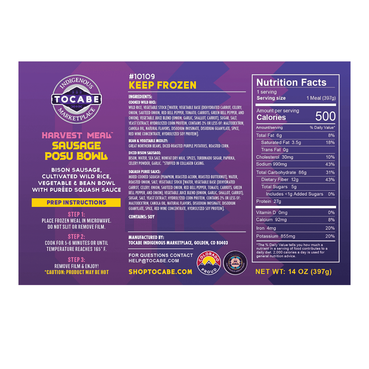 Tocabe's signature Posu Bowl made with Red Lake Nation wild rice, paired with roasted purple sweet potatoes, great northern white beans, fire-roasted corn, and topped with our bison sausage and finished with our puréed roasted squash sauce.