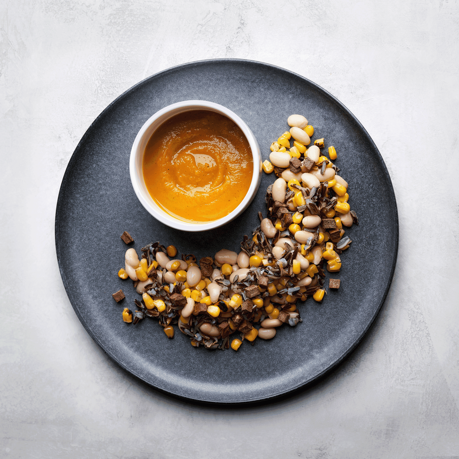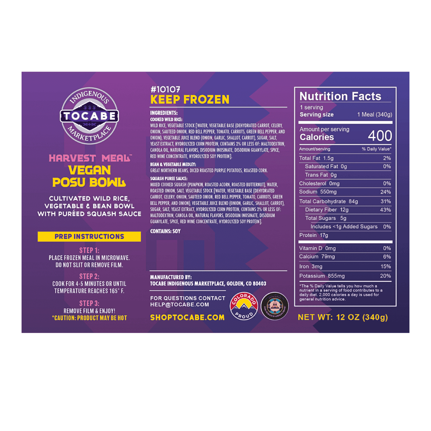 Tocabe's signature Posu Bowl made with Red Lake Nation wild rice, paired with roasted purple sweet potatoes, great northern white beans, fire-roasted corn, and finished with our puréed roasted squash sauce.