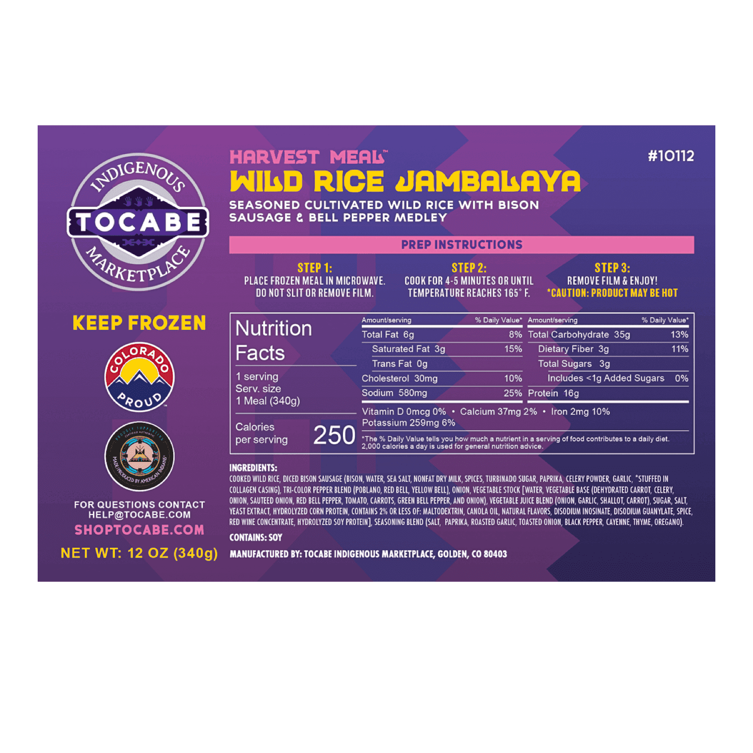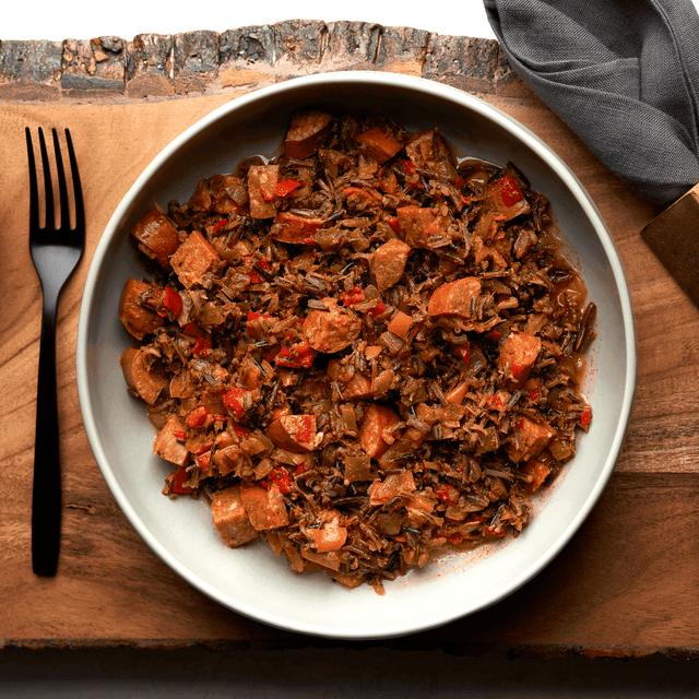 Cultivated wild rice, roasted pepper medley, sweet caramelized onions, and bison sausage cooked with a Houma-style creole seasoning.