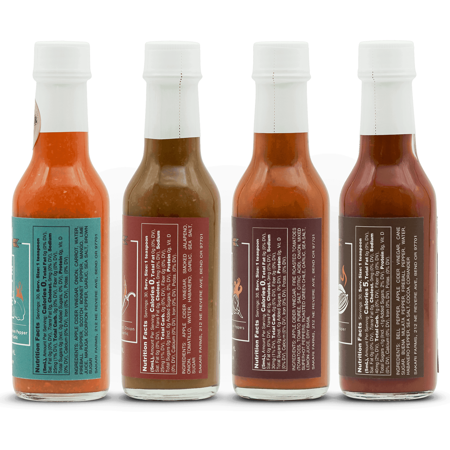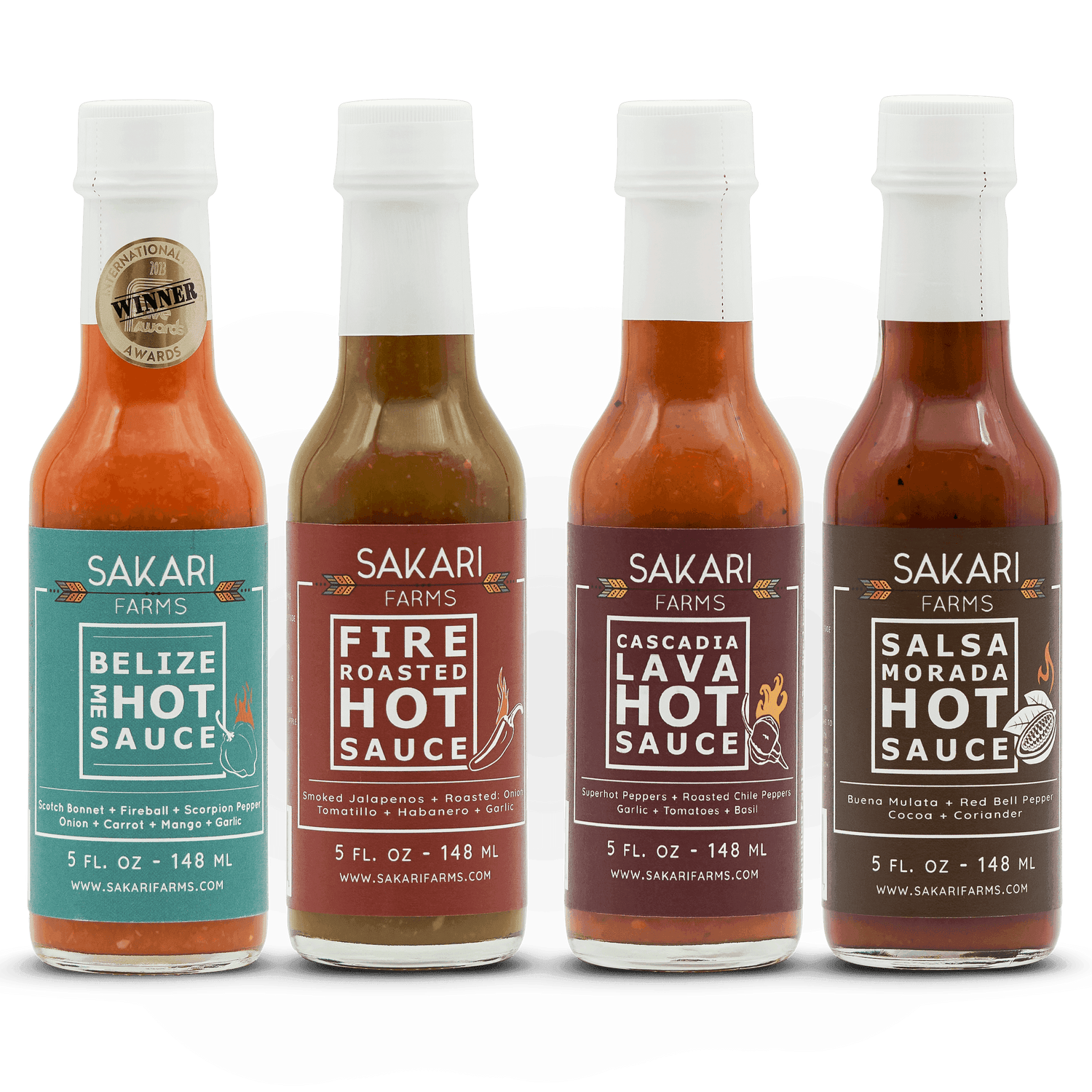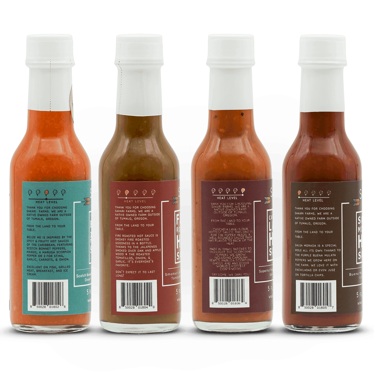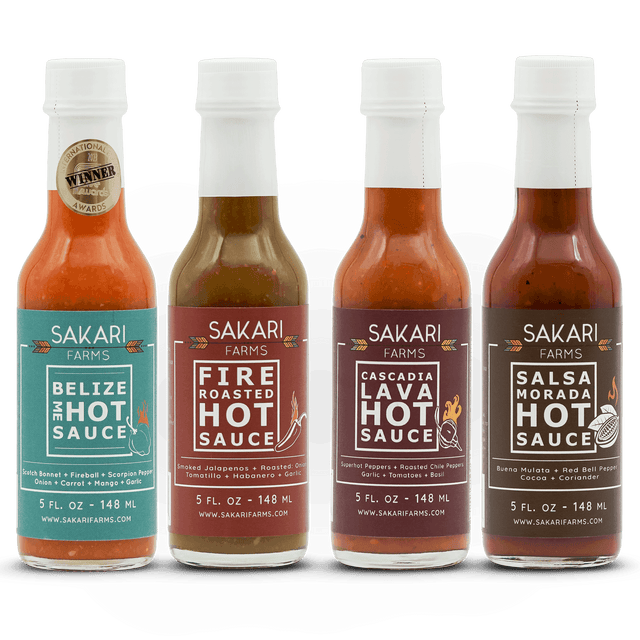 Turn up the heat with a 4-pack of distinctive hot sauces ranging from moderate to off the charts spicy, and flavors ranging from subtly smoky to tangy sweet. Products of Sakari Farms, an Inupiaq tribal farm and educational business in Bend, Oregon.